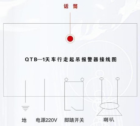 QTB―1天車行走起吊報警器系列產(chǎn)品是專門為天車設(shè)計的報警裝置,在天車行走、起吊時發(fā)出聲光報警信號,增強生產(chǎn)人員的安全意識。當天車運行或起吊機構(gòu)起動時,通過外部繼電器觸點接通裝置,使閃光燈發(fā)出旋轉(zhuǎn)紅光,揚聲器發(fā)出報警聲響,以提示生產(chǎn)人員。天車在行走起吊或靜止時,按住送話器的開關(guān),司機可以對外喊話。該裝置由AC220V電源輸入,有兩組可選的開關(guān)量輸入,一組16歐15-25瓦揚聲器,詳細原理框圖請參閱附錄。