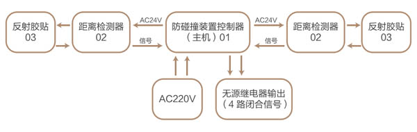 防碰撞裝置系列產(chǎn)品由防碰撞控制器(主機(jī))距離檢測(cè)器,鉆石級(jí)反射板或反射膠貼等附件組成。