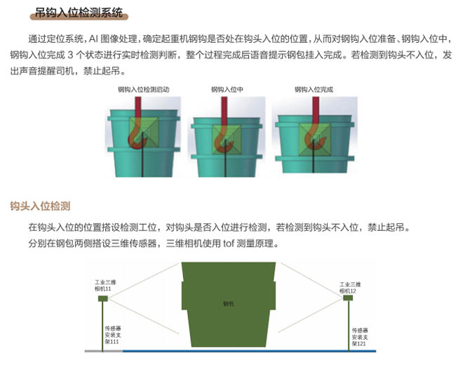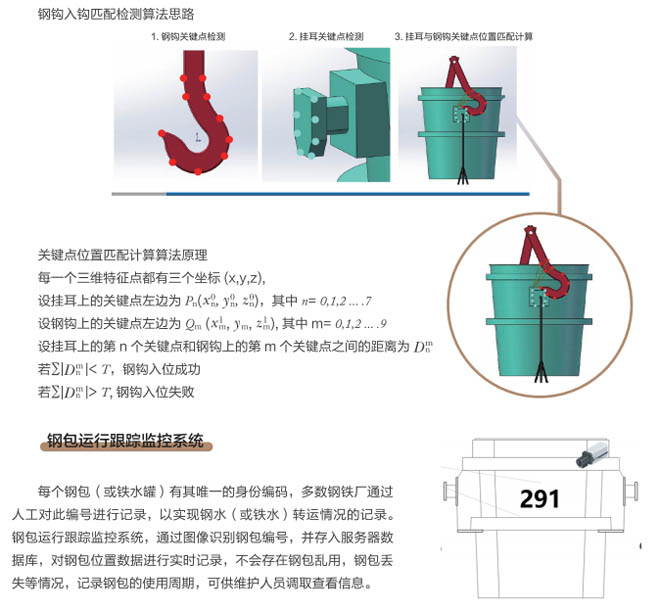 近年來,冶金行業(yè)智能化、自動化、云時代等大數(shù)據(jù)廣泛應(yīng)用,煉鋼車間是冶金行業(yè)的重點區(qū)域,廠區(qū)設(shè)備復(fù)雜、環(huán)境差、安全隱患多等因素更需要進行設(shè)備自動化、智能化的升級管理、實現(xiàn)廠區(qū)無人化智慧工廠目標的發(fā)展。起重機作為煉鋼、煉鐵、軋鋼車間的主要設(shè)備,起重機工作中對在工位操作越來越精準,需要駕駛員及時準確觀察工位狀態(tài),由于駕駛室的位置和現(xiàn)場的工況環(huán)境影響經(jīng)常引起操作失誤,鋼包起吊安全事故頻發(fā),特別是對于鋼包掛鉤是否完整嵌入掛耳,是否進入正確的起吊姿態(tài)沒有直接的判斷和監(jiān)控。研發(fā)起重機鋼包定位掛鉤識別管理系統(tǒng)是安全生產(chǎn)的剛性需求。